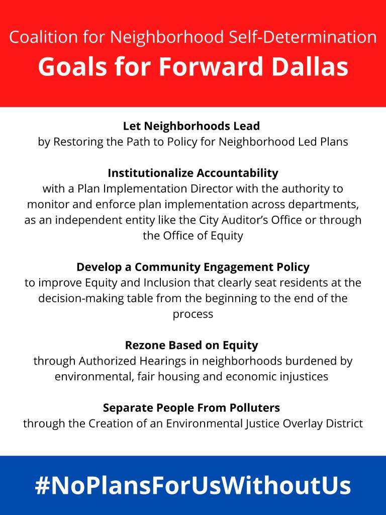 The goals outlined below are specific policy items from within the Bill of Rights that can be institutionalized through the ForwardDallas Comprehensive Land Use Plan update, which began in August 2021 and is ongoing through 2023.