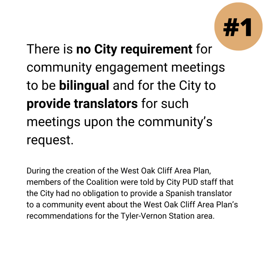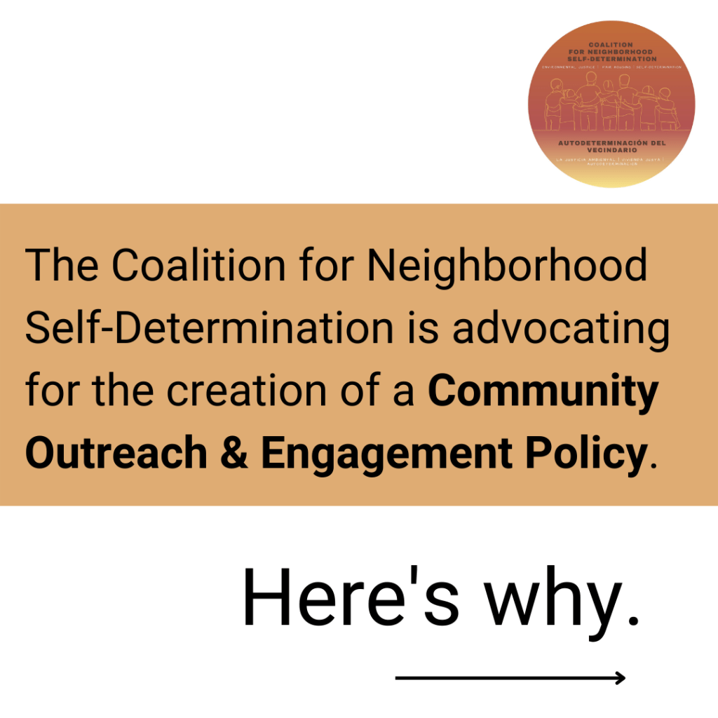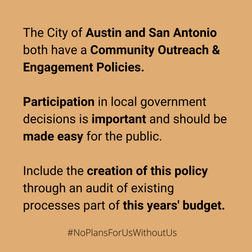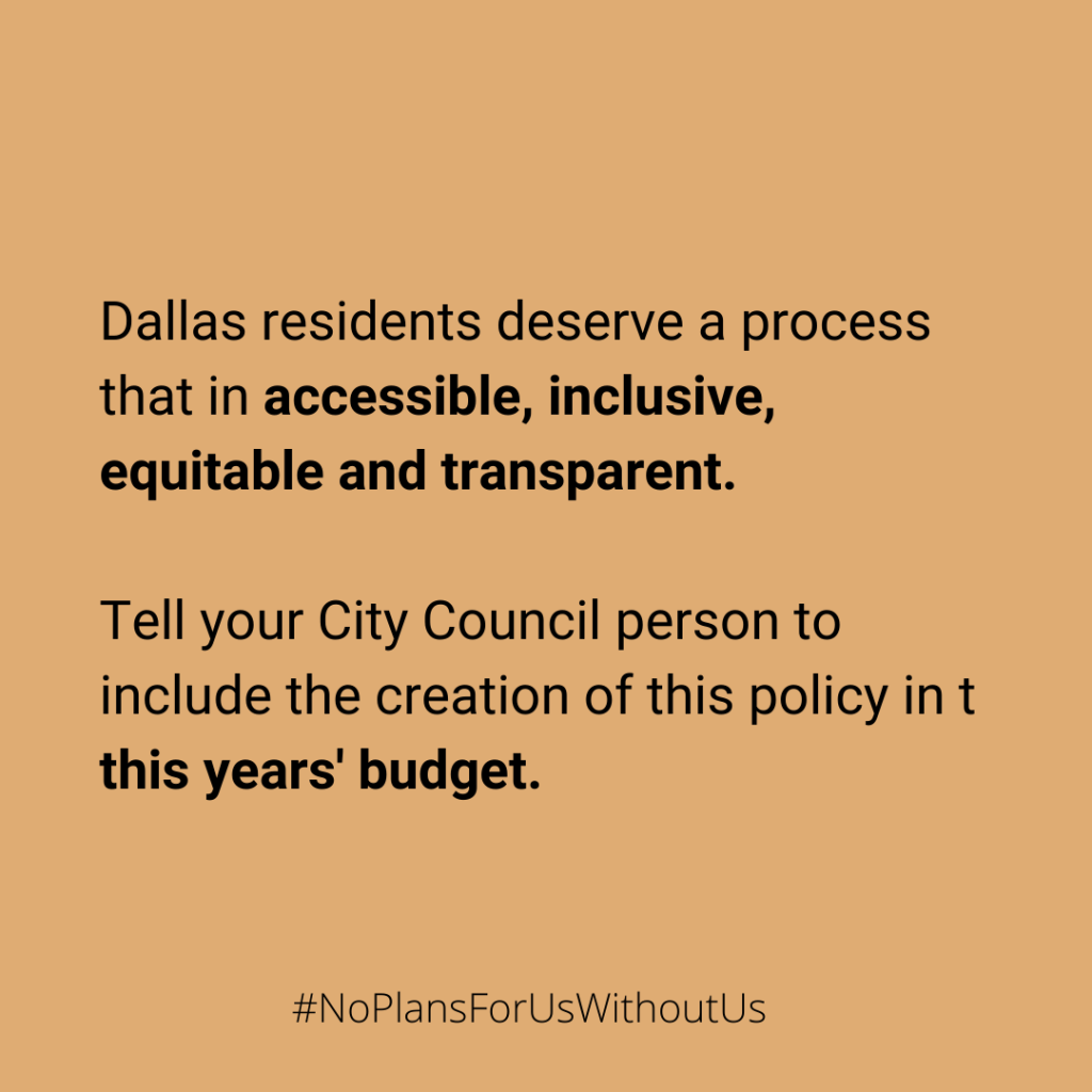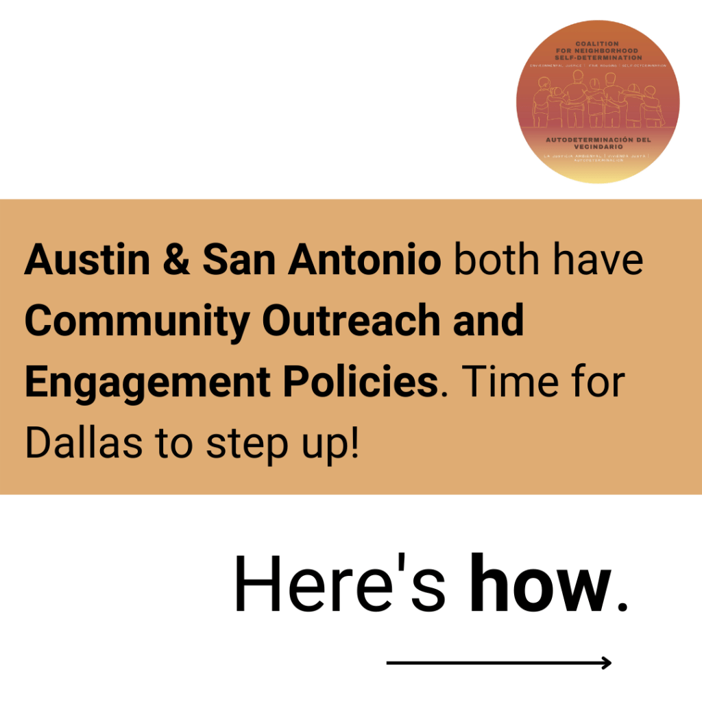 In Spring and Summer 2022, the Coalition worked with member organization Ethos Equity Consulting, to draft recommendations for the City of Dallas to consider creating a community outreach and engagement policy. Here is the document created in June 2022 that was presented to City Council and Staff: