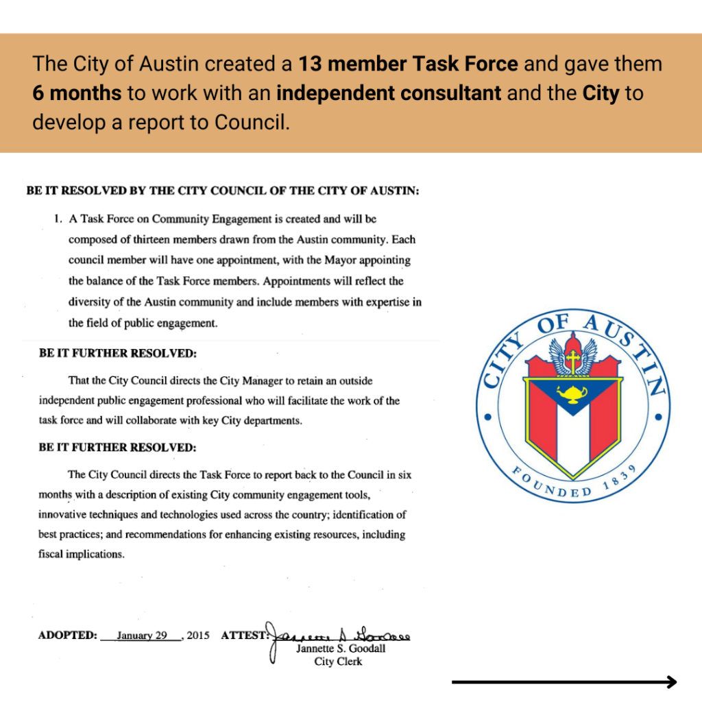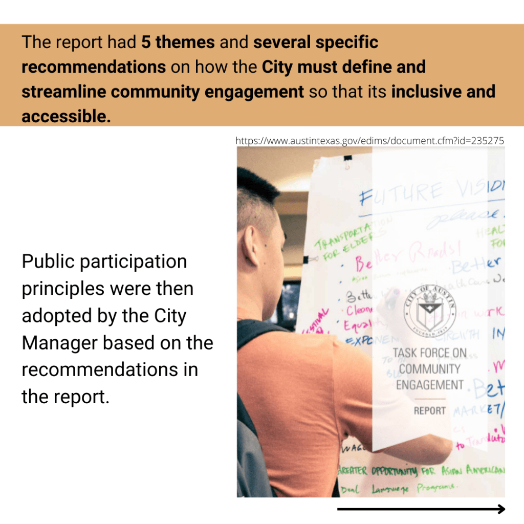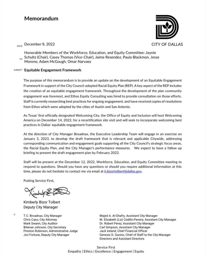 After a series of meetings, the need to create a community outreach and engagement framework was included in the City of Dallas Racial Equity Plan, adopted in August 2022. The Coalition and Ethos Equity continued to work with Council and staff on how to move forward with the creation of this policy.