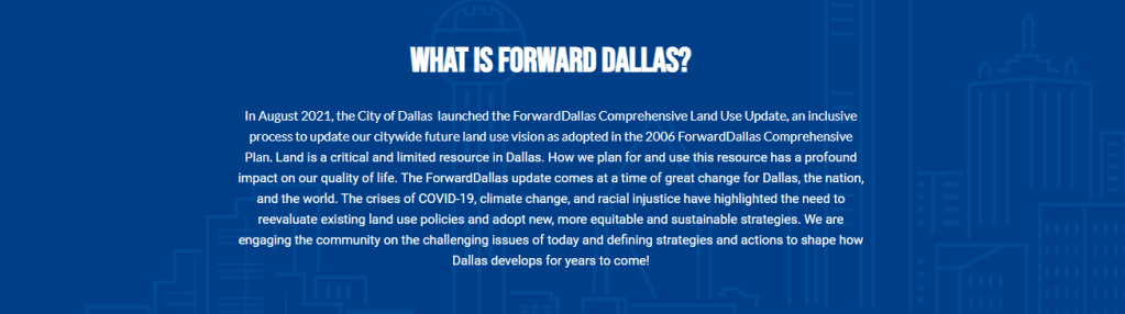 ForwardDallas is the Comprehensive Land Use Plan for the City of Dallas. It was first created and adopted in 2006 and has not been updated since then. A Comprehensive Land Use Plan informs development, investment and can inform zoning changes in the City. This is why it is so important. Neighborhoods that are dealing with a lack of investment, fighting zoning changes that impact their health and quality of life, and development that is not aligned with the neighborhodos vision, have a chance to tell the City what we want in our communities!
