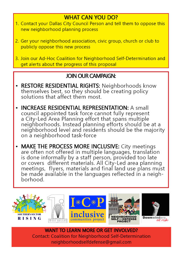There are many member organizations of the Coalition that have supported the creation of neighborhood-led land use plans through the “Neighborhood Self-Defense Project” (NSDP). The NSDP was launched in collaboration between Southern Sector Rising, Downwinders at Risk and the Inclusive Communities Project in December 2019 to support the drafting of the Floral Farms Neighborhood-Led Land Use Plan with Neighbors United/Vecinos Unidos.