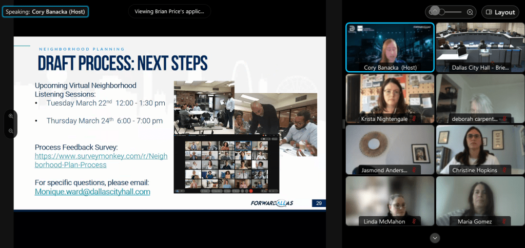 Specifically, the “Urban Design Committee” that previously reviewed neighborhood-led plans and then made recommendations to the City Plan Commission, was apparently slated to be dissolved and replaced with a new committee that would oversee ForwardDallas and plan implementation. No timeline for when this committee would be formed, or when the residents would be able to work with them to adopt their neighborhood plan was provided by PUD.